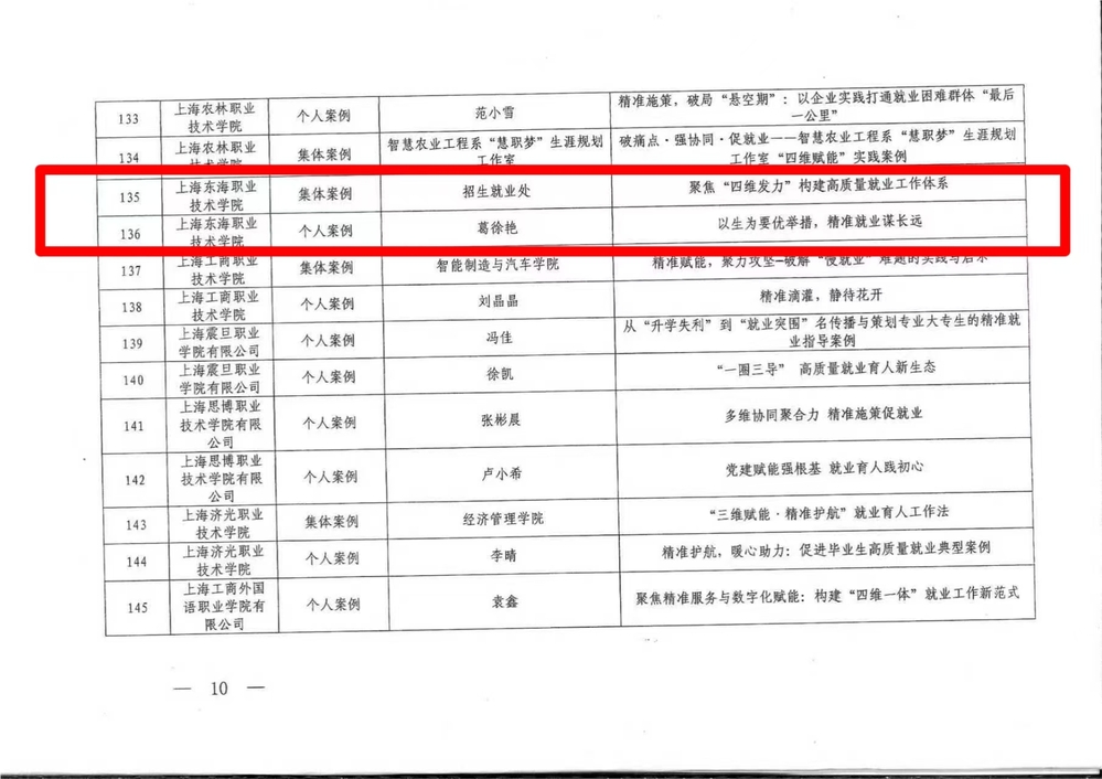 根据《上海市教育委员会关于开展2025年上海高校毕业生就业工作典型案例推荐活动的通知》(沪教委学〔2025〕50号)要求,经推荐与评审,我校招生就业处(集体案例)、航空学院葛徐艳(个人案例)分别获评“2025年上海高校毕业生就业工作典型案例”。